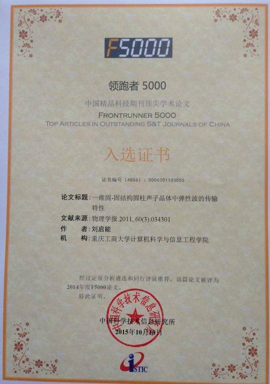 《物理学报》在2010-2014年内发表的4000多篇论文中提名34篇论文参加本年度的“领跑者5000”评选,其中刘启能教授的3篇论文入选,在《物理学报》排名第一。