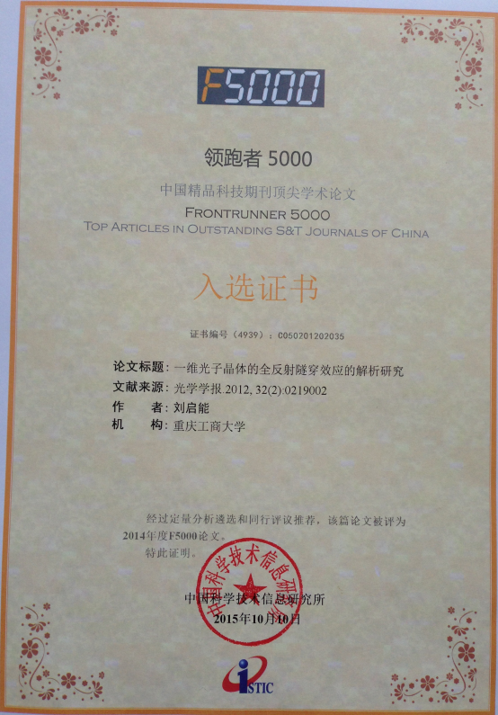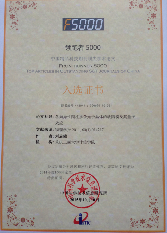 最近中国科学技术信息研究所公布了2015年度"领跑者5000—中国精品科技期刊顶尖学术论文(F5000)"的评选结果,2138CC太阳集团的刘启能教授在《物理学报》发表的3篇论文和在《光学学报》发表的1篇论文都被入选。一名作者在一次评选中有4篇论文入选的在全国也极少。