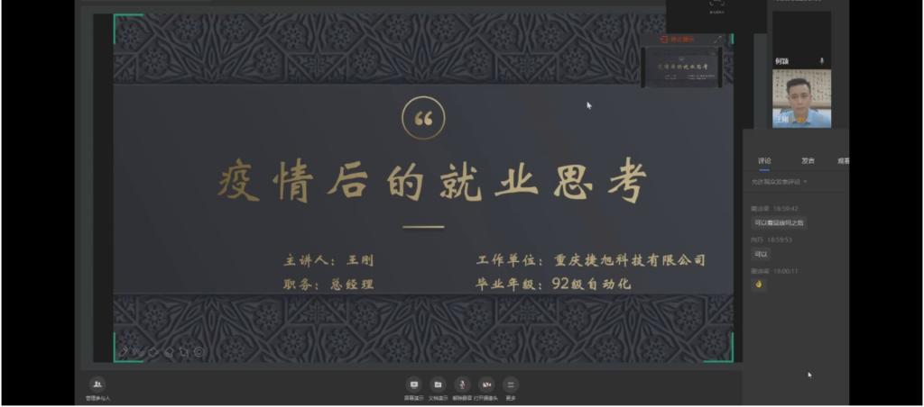 为帮助学生进一步了解疫情影响下的就业环境、就业需求,增强学生个人职业规划能力,树立就业发展意识,6月19日学院特邀重庆捷旭科技有限公司总经理,院校友分会副会长,92级自动化专业校友王刚,通过企业微信为广大同学开展了一场深入的线上就业讲座。