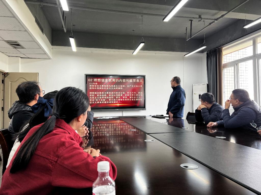 会议第一阶段是开展“坚定理想信念 补足精神之钙”主题党日活动,由李明领学习近平总书记有关理想信念内容的节录。在领学中,李明首先通过一段视频带领大家回顾了习总书记对理想信念的相关论述,然后对理想信念教育的内容和重要意义进行阐述,最后,结合当前课程思政工作,重点论述了在课程中融入理想信念教育的主要路径和方法。