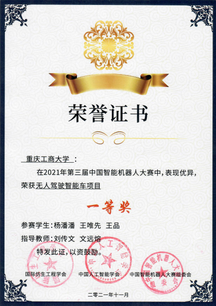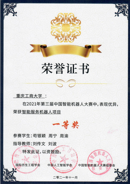 来自我院AI机器人科创团队的参赛作品《智能服务机器人项目》(作者:苟银颖、周宁、周渝,指导老师:刘传文、刘波)获得全国一等奖。
