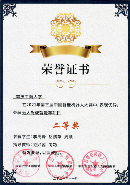 来自我院AI机器人科创团队的参赛作品《无人驾驶智能车项目》(作者:李禹锋、岳鹏举、周顺,指导老师:范兴容、向巧)获得全国二等奖。