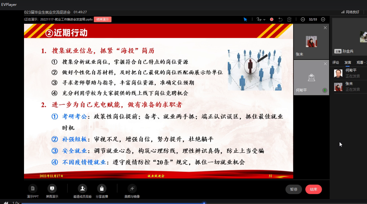 会议开始,主持人张未介绍了参会人员。接下来,何希平先宣讲就业形势与对策,提出了2023届毕业生就业工作的主题词为“端正认识,主动出击,多路并发,决胜大考”。何希平回顾了过去3年学院毕业生的就业状况,又分析了2023届严峻的就业形势,指导全体毕业生要树立正确的职业观、就业观、择业观,在当前的就业背景下,不仅要主动搜集就业信息,更要抓紧“海投”,同时要自己充电赋能,做有准备的求职者。