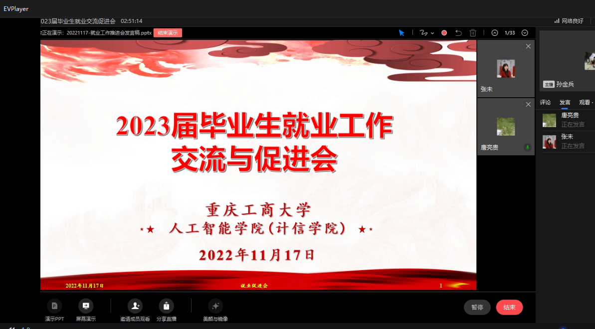 新冠肺炎疫情迁延反复使得我国高校毕业生就业形势更加严峻,对我国“稳就业”工作带来了巨大挑战。为贯彻“三全”促进毕业生就业创业的工作要求,2022年11月17日19时,2138cc太阳集团官网在线上举办了勇往“职”前——2023届毕业生就业工作交流与促进会。学院党委书记何希平、院长唐亮贵、党委副书记张未、副院长杨光详、副院长秦华锋、就业联络员孙金兵、各专业教师、毕业班辅导员和2023届全体毕业生参加了本次会议,与会师生对当下的就业前景和状态分别进行了交流发言。