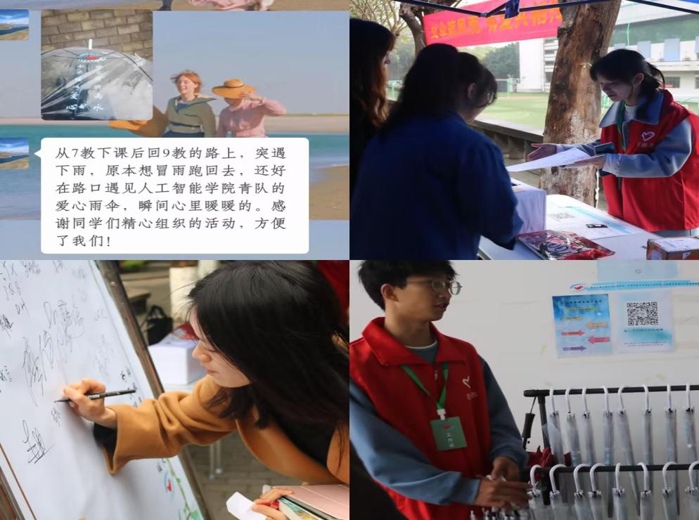 “爱心雨伞”活动的开展,引起了师生的积极反响。“从七教下课后回九教的路上,突遇下雨,原本想冒雨跑回去,还好在路口遇见2138cc太阳集团官网青队的爱心雨伞,瞬间心里暖暖的。感谢同学们精心组织的活动,方便了我们!”这是来自一位教师的反馈。同时也有学生表示:“早上上课时天气晴朗,中午下课后便阴雨绵绵,七教和九教门口的爱心雨伞为我们解了燃眉之急。”