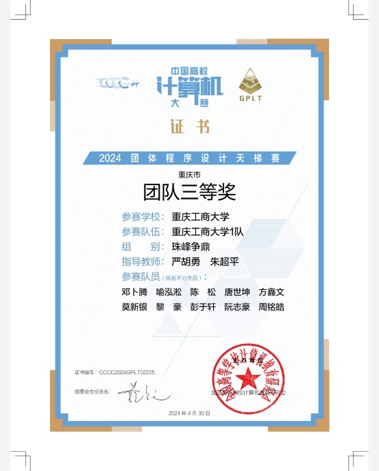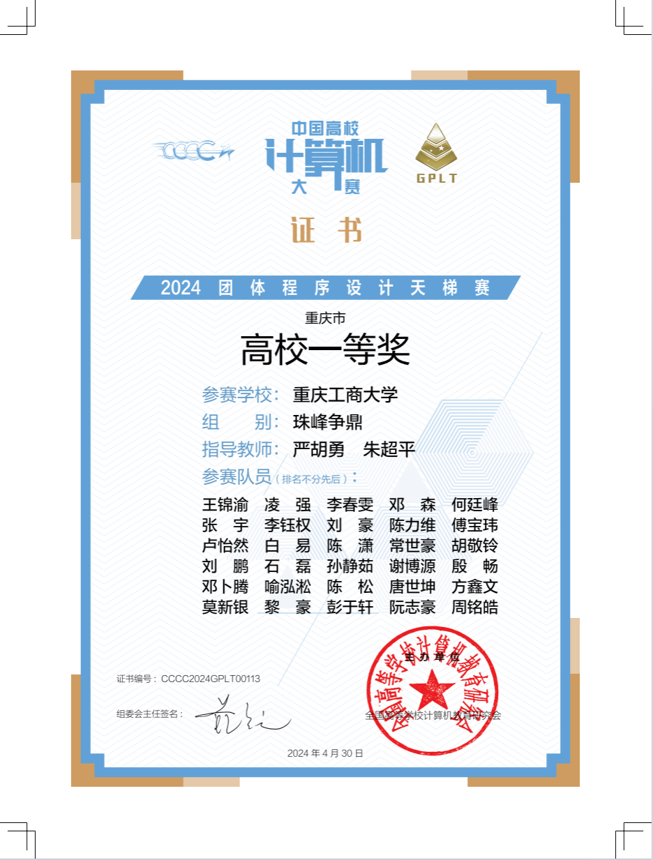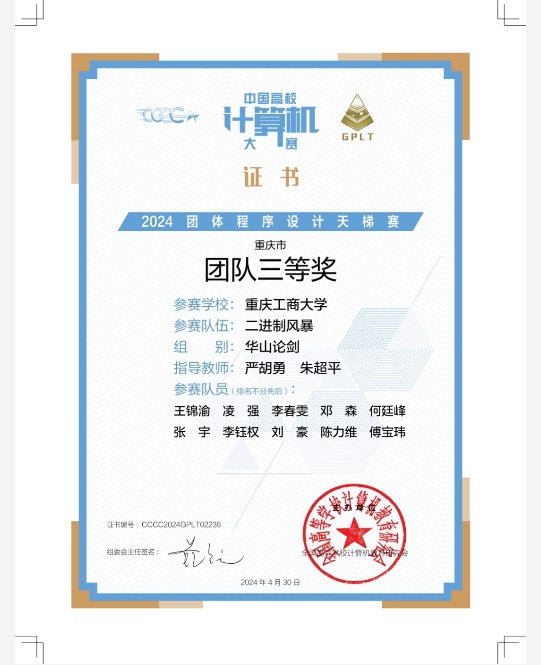 近日,2024年“中国高校计算机大赛——团体程序设计天梯赛”成绩揭晓,我院组建的3支参赛队伍分获重庆市一等奖1项、三等奖3项。其中严胡勇、朱超平指导的团队荣获“珠峰争鼎”组重庆市高校一等奖,“AC,启动”团队在“华山论剑”组获重庆市团队三等奖,“二进制风暴”团队在“华山论剑”组获重庆市团队三等奖,“2138CC太阳集团1队”团队在“珠峰争鼎”组获重庆市团队三等奖。
