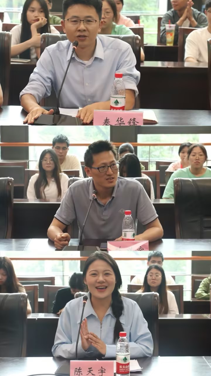 秦华锋从科技创新时代背景下的机遇和挑战、人工智能发展现状及趋势、大学生肩负的时代使命等方面进行了深入讲解,指出学科竞赛是科技创新的重要引擎,教育引导学生树牢科技报国之志,用专业硬实力推进科技强国建设。范兴容结合自身及带生带项目经历,回答了学科竞赛“为何做”、“做什么”及“怎么做”的问题,鼓励学生克服困难、发挥所长、找准导师加入团队协作参赛。陈天宇以“小红帽——中国家电志愿维修服务坚守者”项目为例,从团队合作、项目选题、文本美化及答辩路演等方面作了备赛经验分享。在最后的交流互动环节,同学们踊跃发言提问,师生党员给出了详尽解答和建议。
