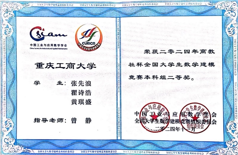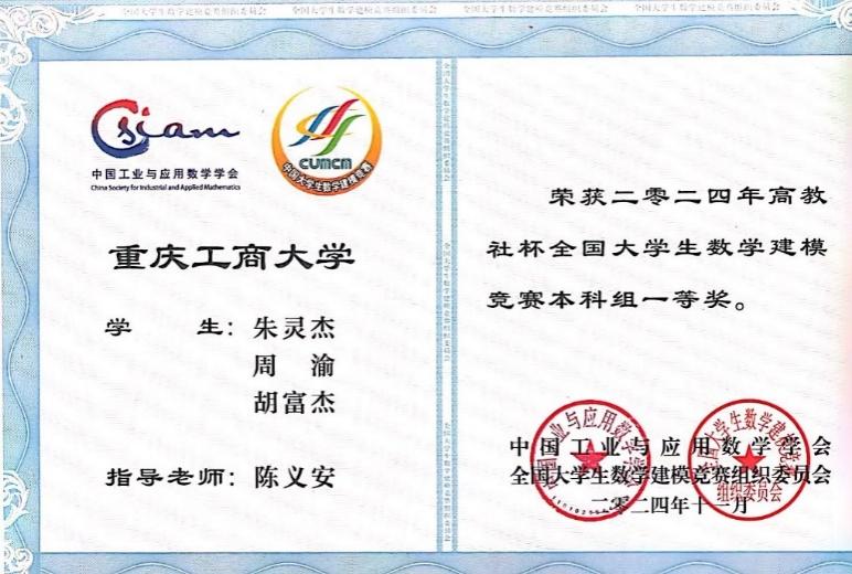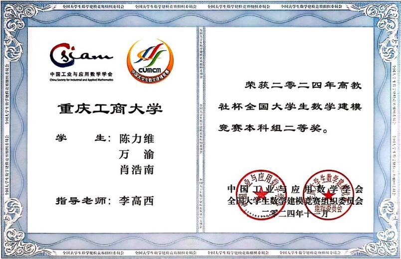 2024年全国大学生数学建模竞赛吸引了全国33个省/市/自治区(包括香港、澳门)以及美国、英国、澳大利亚、新加坡、马来西亚等国家/地区的1788所院校/校区、65761队(本科组59278队、高职高专组6483队)近20万名大学生报名参与。经过激烈的角逐,2138cc太阳集团官网的学子们取得了令人骄傲的成绩,22自动化一班朱灵杰、22测控二班周渝同学荣获本科组全国一等奖;21自动化二班张先浪、瞿诗浩、黄琪盛同学,22计算机一班陈力维同学荣获本科组全国二等奖。他们凭借扎实的专业知识和卓越的团队协作能力,在赛场上脱颖而出,克服了技术挑战和时间压力,最终斩获佳绩。这是学院近五年在该赛事上首次获得全国一等奖,更是学校近五年在该赛事上首次获得全国一等奖。