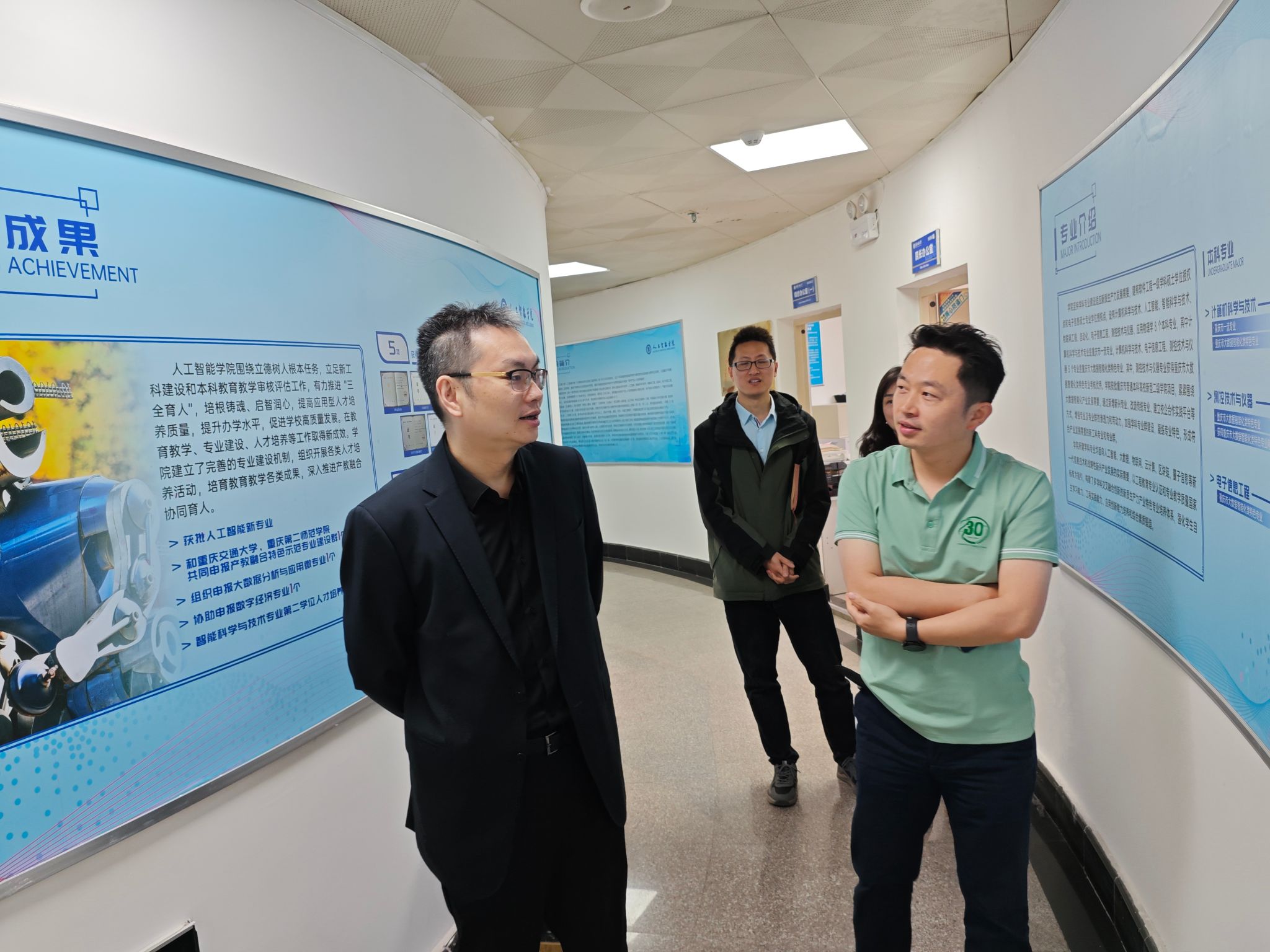 温涛校长一行首先实地参观了学院文化墙,走访办公区域,深入了解学院的文化底蕴与日常办公教学环境。随行过程中,2138cc太阳集团官网院长申渝详细介绍了学院在专业布局优化、学生培养成效、师资队伍建设、学科科研进展以及实验室与教学实践场地配备等方面的工作举措与阶段性成果。温校长对学院前期的努力与成绩给予充分肯定,并针对实际情况提出了建设性意见。