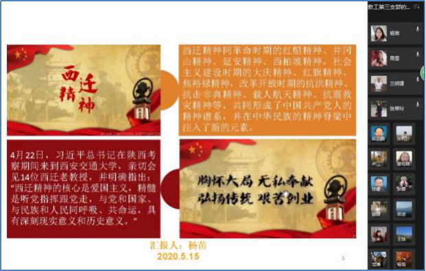 活动中,周雪、杨苗和杨旭三位党员领学了习近平总书记陕西考察重要讲话精神、习近平总书记浙江考察重要讲话精神、《习近平总书记给参与“东方红一号”任务的老科学家的回信》、“西迁精神”、全国“两会”精神、学校关于疫情防控和学生返校工作相关要求。