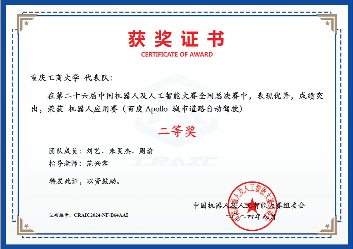 8月25日,第二十六届中国机器人及人工智能大赛全国总决赛在江苏宜兴成功举行。来自清华大学、哈尔滨工业大学、浙江大学等208所高校的407支队伍、1300余名选手,就自动驾驶、机器人、人工智能等领域的前沿技术展开激烈角逐和技术交流。此次盛会吸引了超过200位机器人与人工智能领域的专家学者、行业精英,共同探讨前沿技术与实际应用。在此次大赛中,我校2138cc太阳集团官网AI机器人科创团队表现优异,在“百度Apollo城市道路自动驾驶”赛项中斩获全国二等奖(团队成员:刘艺、朱灵杰、周渝,指导教师:范兴容)。