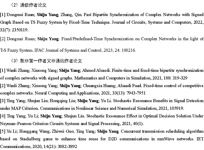 [1].ShijuYang; Wanli Zhang; Dongmei Ruan; Ting Yang; Yu Li. Fast fixed-time impulsive bipartite synchronization of TS fuzzy complex networks with signed graphs. Nonlinear Analysis: Hybrid Systems, 2023, 48: 101325(SCI,JCR Q1)