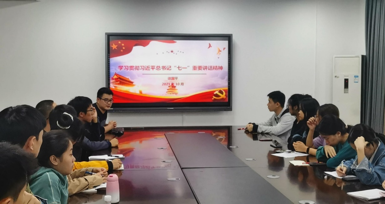 2021年10月11日18:00,学习贯彻习近平总书记“七一”重要讲话精神宣讲活动在学院90810会议室举行。此次宣讲活动由学院辅导员徐国平老师讲授,学生一、二支部全体学生党员参加了此次活动。