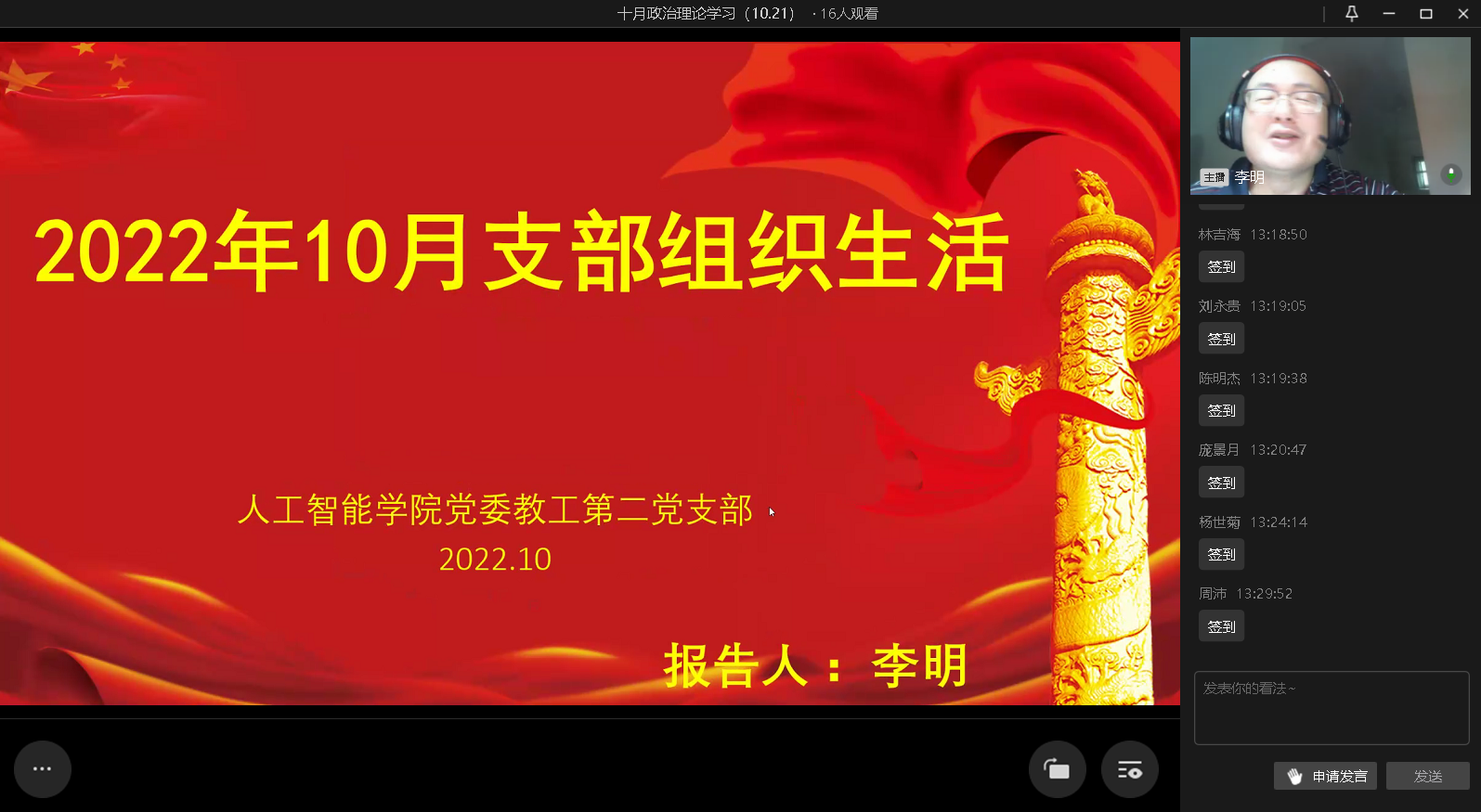 2022年10月21日2138cc太阳集团官网教工二支部在企业微信以线上会议的方式开展十月份支部组织生活,活动由支部书记李明同志主持。