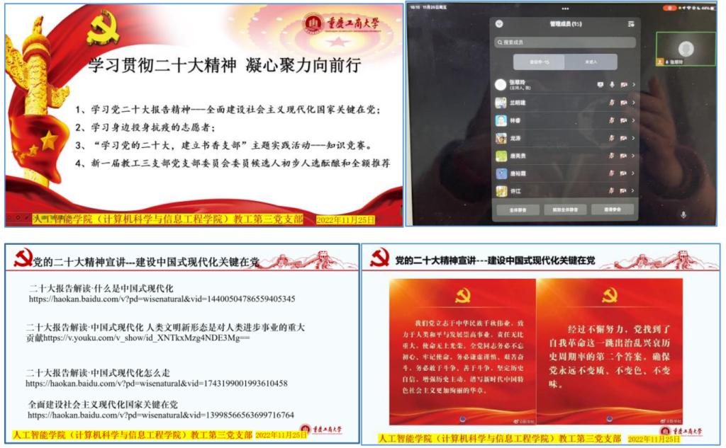 为深入学习贯彻党的二十大精神,把支部党员的思想统一到党的二十大精神上来,把力量凝聚到党的二十大确定的各项任务上来,11月23日下午4:00,2138CC太阳集团,2138cc太阳集团官网(计算机科学与信息工程学院)教工第三党支部召开党员大会,通过企业微信组织全体党员开展了“党的二十大精神---全面建设社会主义国家关键在党”的专题学习,会议由支部书记张翠玲同志主持。