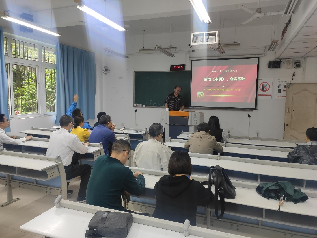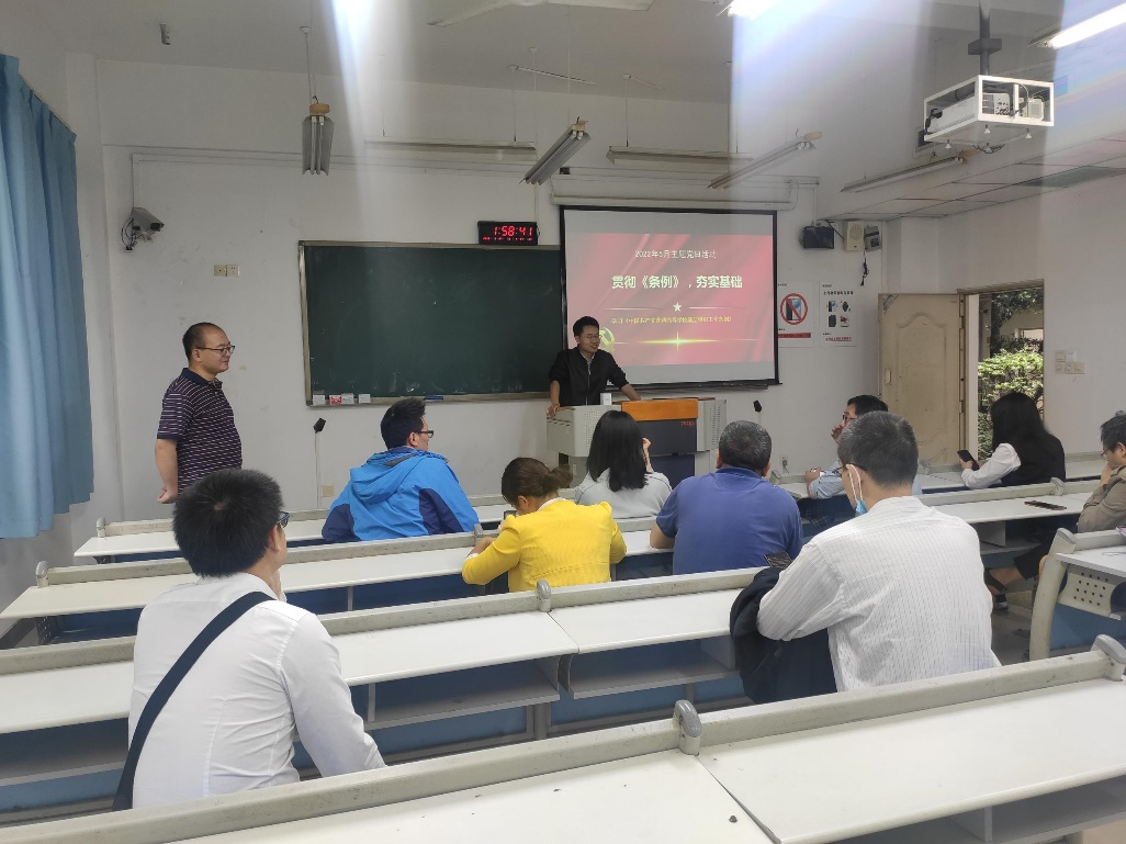 第二阶段为面向全体支部党员的主题党日活动。本月主题党日活动的主题为“贯彻《条例》,夯实基础——学习《中国共产党普通高等学校基层组织工作条例》”(以下简称《条例》)。李明从《条例》的概况、《条例》修订的主要内容、《条例》修订和颁布的重大意义,以及如何贯彻和落实《条例》四个方面对《条例》进行解读。他强调,加强党对高校的领导,加强和改进高校党的建设,是办好中国特色社会主义大学的根本保证。《条例》的实施汇聚起为党育人、为国育才的磅礴力量,为坚持和加强党对高校的全面领导为培养社会主义建设者和接班人提供坚强组织保证。