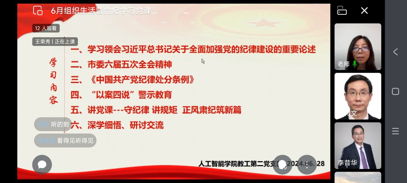 2024年6月28日,正值午后,企业微信线上直播室里,我院教工二支部全体党员齐聚一堂,共同开展了本月的党组织生活活动。本次活动的重点是学习习总书记关于全面加强党的纪律建设的重要论述,领会重庆市委六届五次全会精神以及巩固中共党纪处分条例。