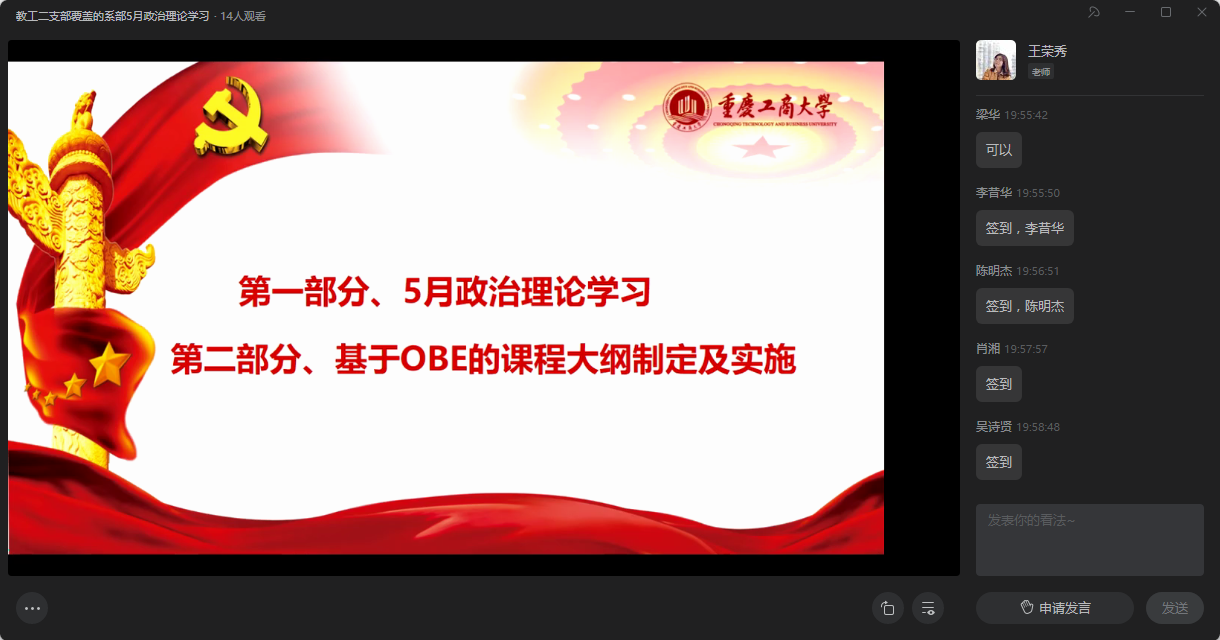 2024年5月26日晚8点,我院教工第二支部在企业微信线上直播平台举行了5月主题党日活动。本次活动由支部书记王荣秀主持,教工二支部的测控与自动化系和电子系全体教师参加。活动分两个主题,一是政治理论学习,二是基于OBE的课程大纲制定与实施培训。活动旨在引导老师们学习习近平总书记的重要讲话精神,增强政治意识,学纪、知纪、明纪、守纪,同时提升业务素质,更好的教书育人。