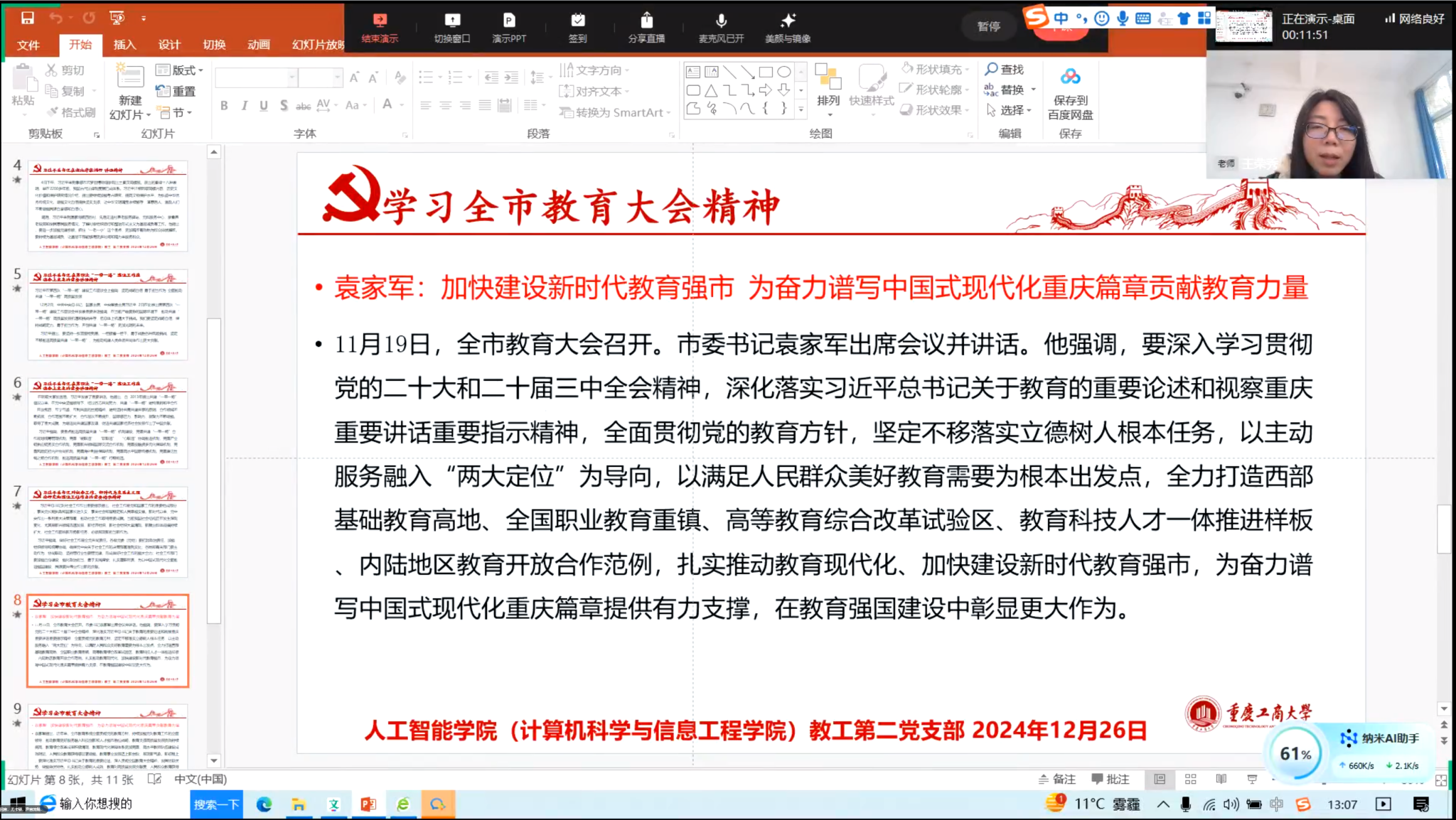 此外,王荣秀书记还带领大家学习了重庆市委书记袁家军关于加快建设新时代教育强市、推进教育现代化的讲话精神。支部党员们一致认为,作为教育工作者,必须紧跟时代步伐,加强自我提升,深化教育教学改革,推动教育现代化。