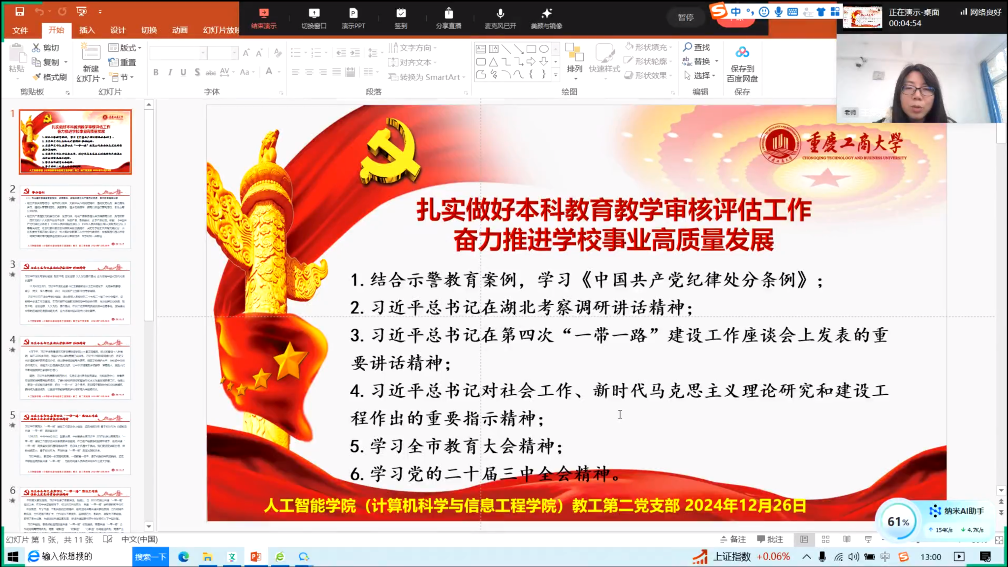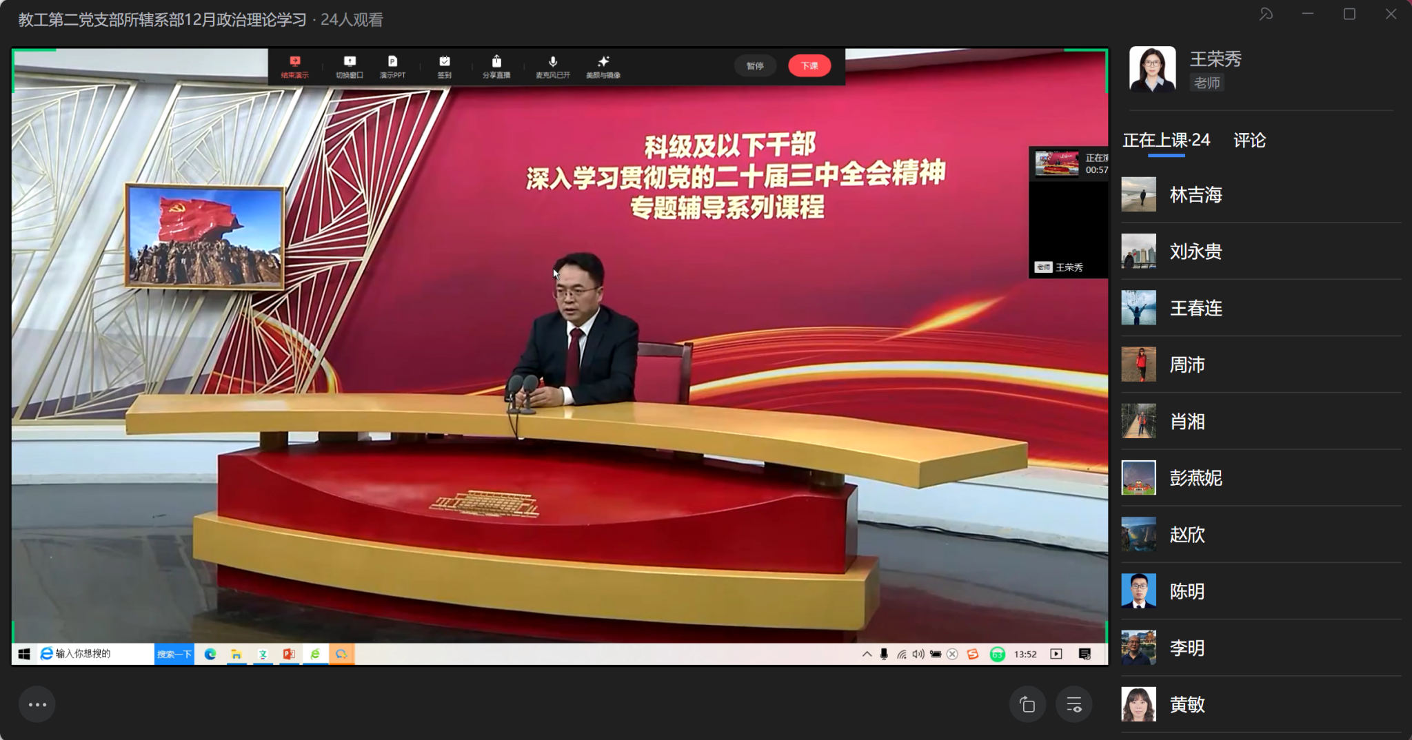 2024年12月26日午间,教工二支部组织了一场政治理论学习活动。本次学习活动由王荣秀书记主持,采用企业微信线上直播的方式进行,支部所辖系部全体教师参加。