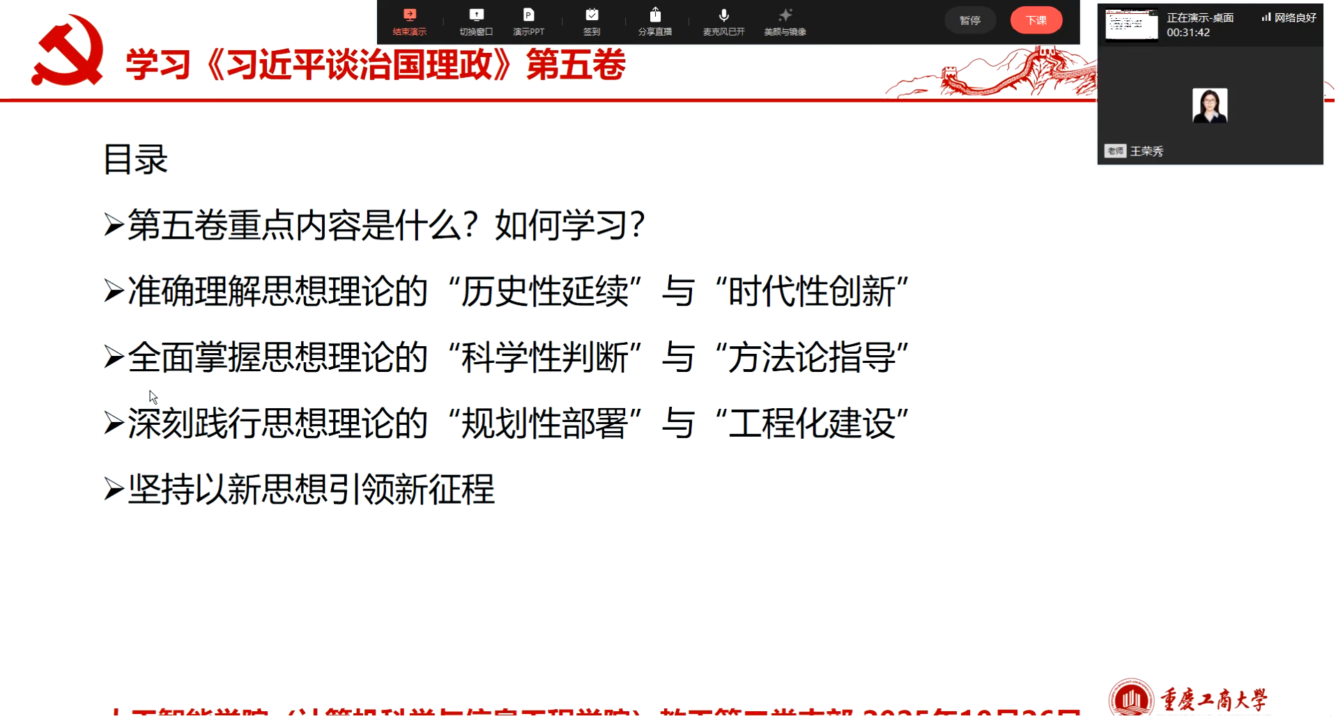 2025年10月26日晚8点,教工第二党支部举行了10月主题党日活动。此次活动通过企业微信线上直播的方式进行,会议由王荣秀书记主持,教工第二党支部全体党员参加了会议。