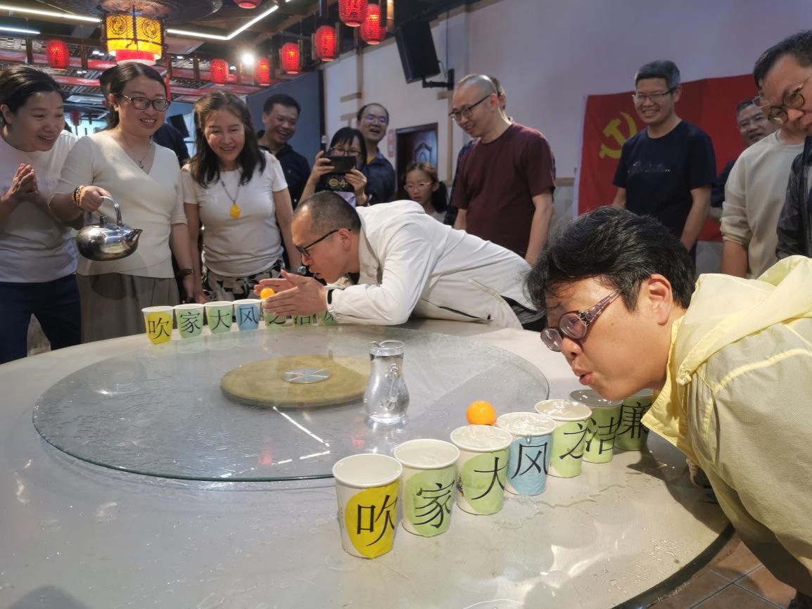 在“廉洁之风大家吹”环节,每组闯关选手以饱满的热情和默契的配合,将乒乓球在贴有“廉洁之风大家吹”7个字的杯子间依次传递,体现了团队协作精神和共同倡廉的决心。