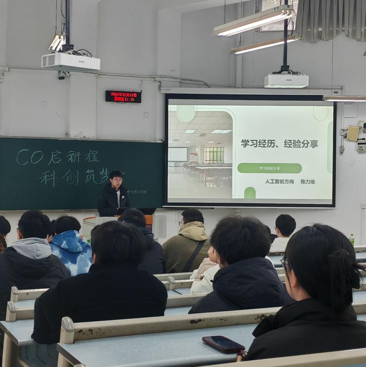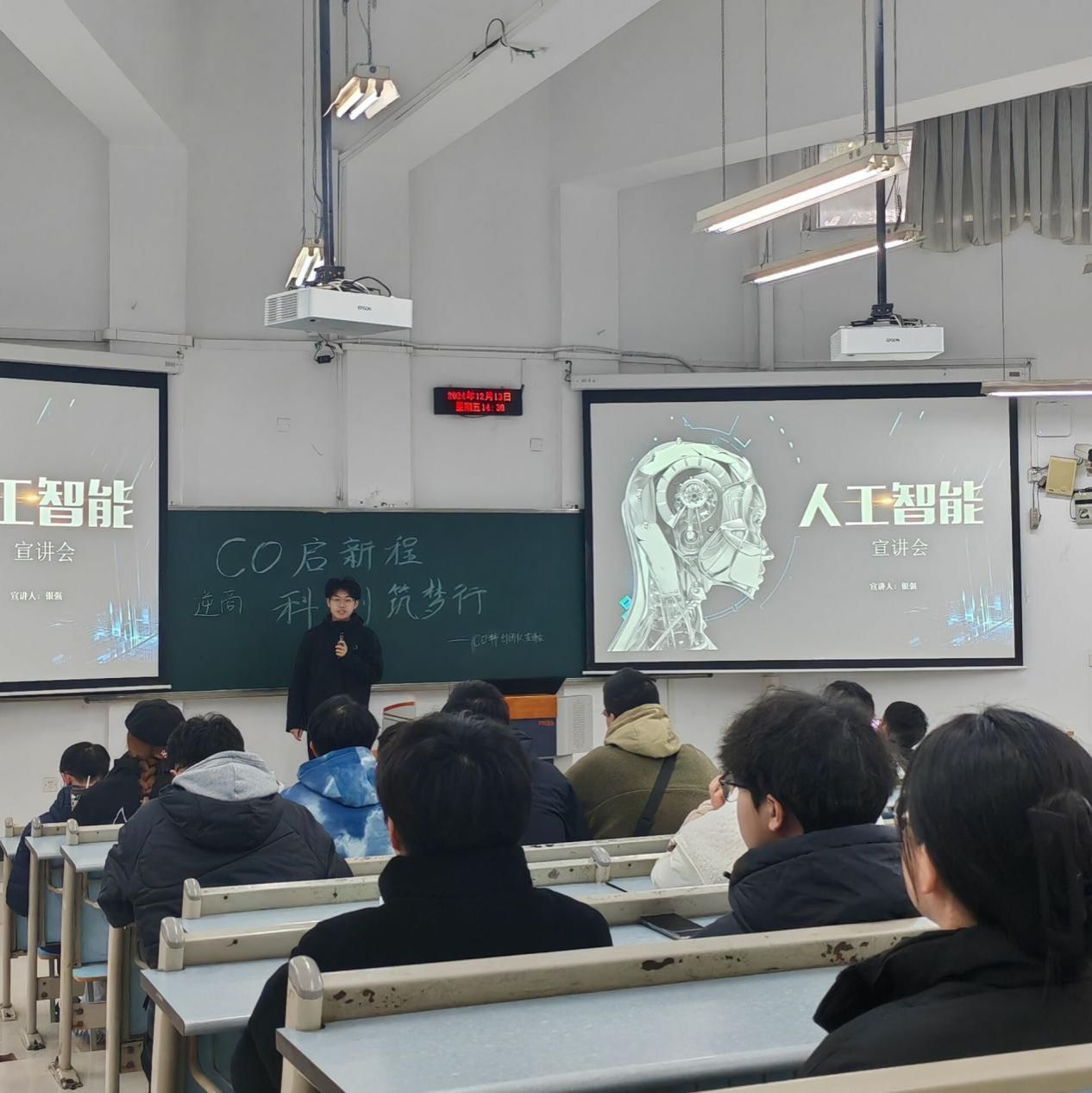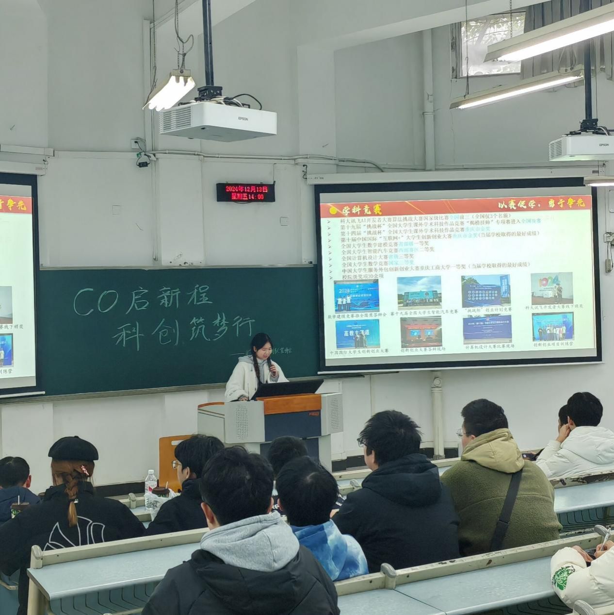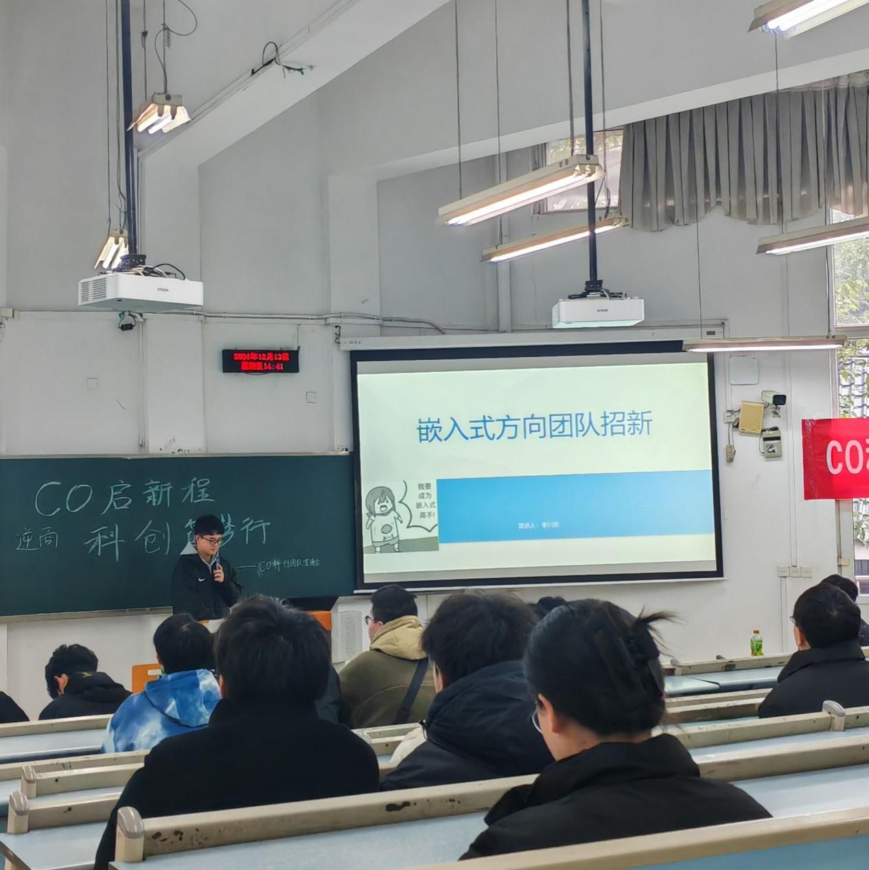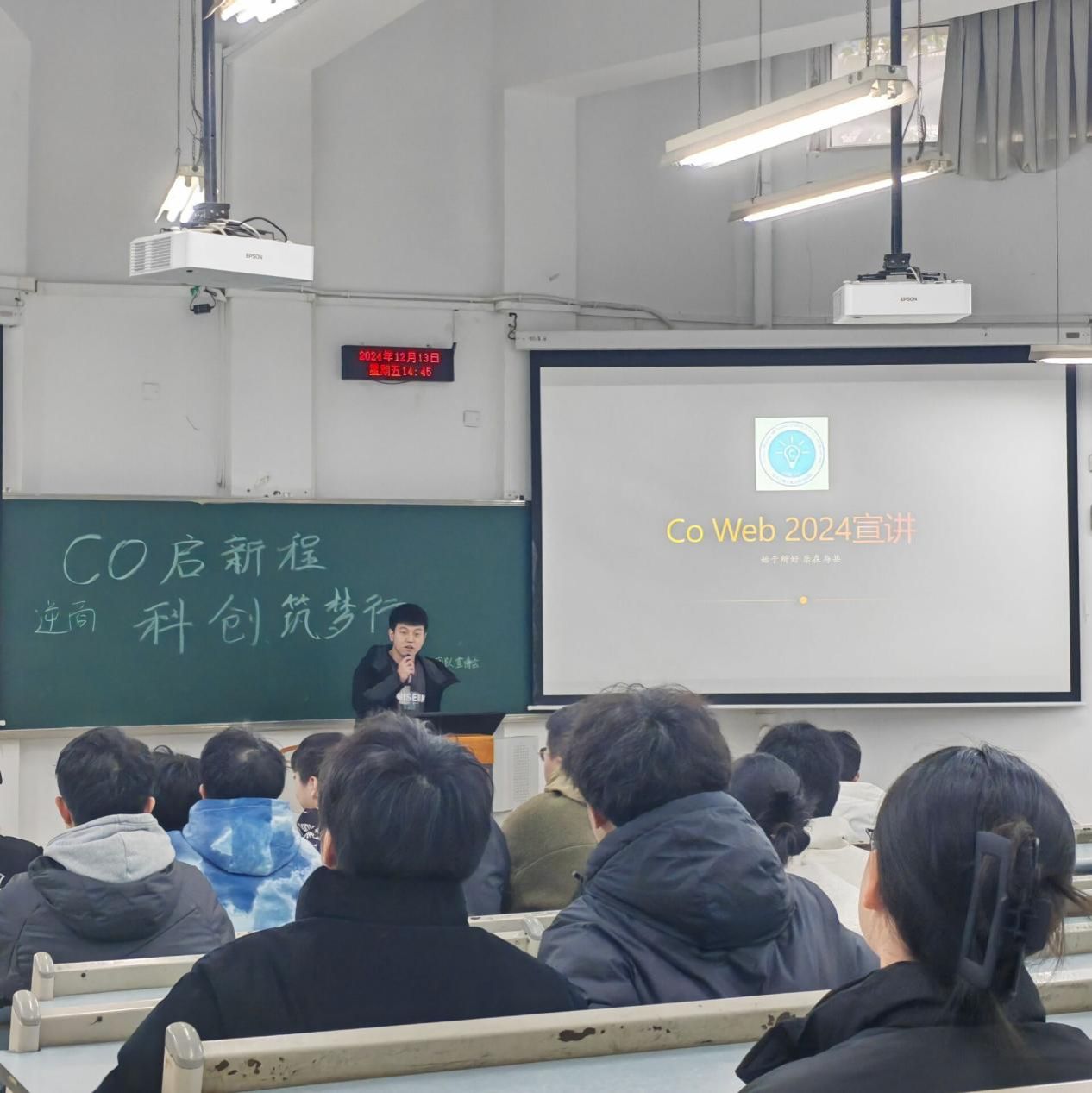 2024年12月13日下午14:00,2138cc太阳集团官网 CO 科创团队在兰花湖校区举行了2024年寒假培训宣讲会。本次活动以“CO启新程,科创筑梦行”为主题,秉持“朋辈帮扶”精神,通过学姐学长的经验分享,帮助新生明确学习方向,规划未来发展路径,并提供切实可行的学习路线。团队成员陈力维、陈惠婷、银强、向明斗、冉金山、李川东等10余人参加,活动由陈潘昕怡主持,吸引了2024级100余名同学参加。