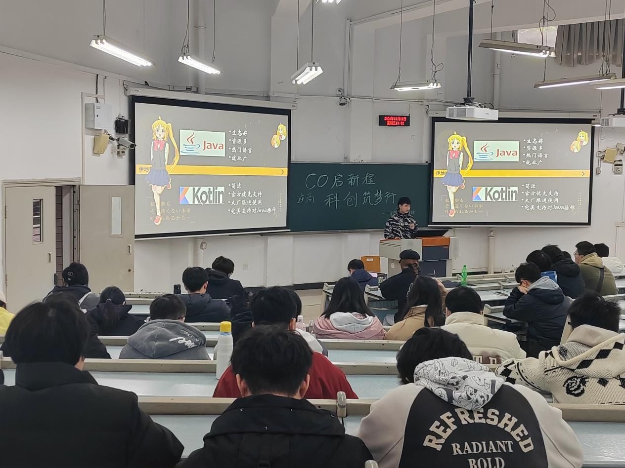 陈潘昕怡简单的进行活动开场后,陈慧婷结合自身学习经历讲述技术学习经验及竞赛心得。陈力维重点围绕竞赛经验和科研经历进行了分享,帮助大一新生规划未来发展路径。陈潘昕怡通过讲述CO历程、团队构成、团队荣誉、团队技术方向四个板块加深了同学们对CO科创团队的认识,并介绍了团队寒假培训的计划。银强以人工智能的基本定义为切入点,详细阐述了人工智能领域的学习路线、资源以及前沿发展,帮助同学们厘清了学习方向与路径。李川东通过自身参赛经历深入介绍了嵌入式方向并给出了学习建议。向明斗用生动的网页展示,详细介绍了Web开发的前后端知识,结合“星河留恋墙”和“量子纠缠”等创新项目,让同学们对Web开发产生了浓厚的兴趣。最后,冉金山通过介绍APP的开发语言和原生库,对APP方向进行了详细的解读以及学习建议的传授,并展示了相关实战项目。