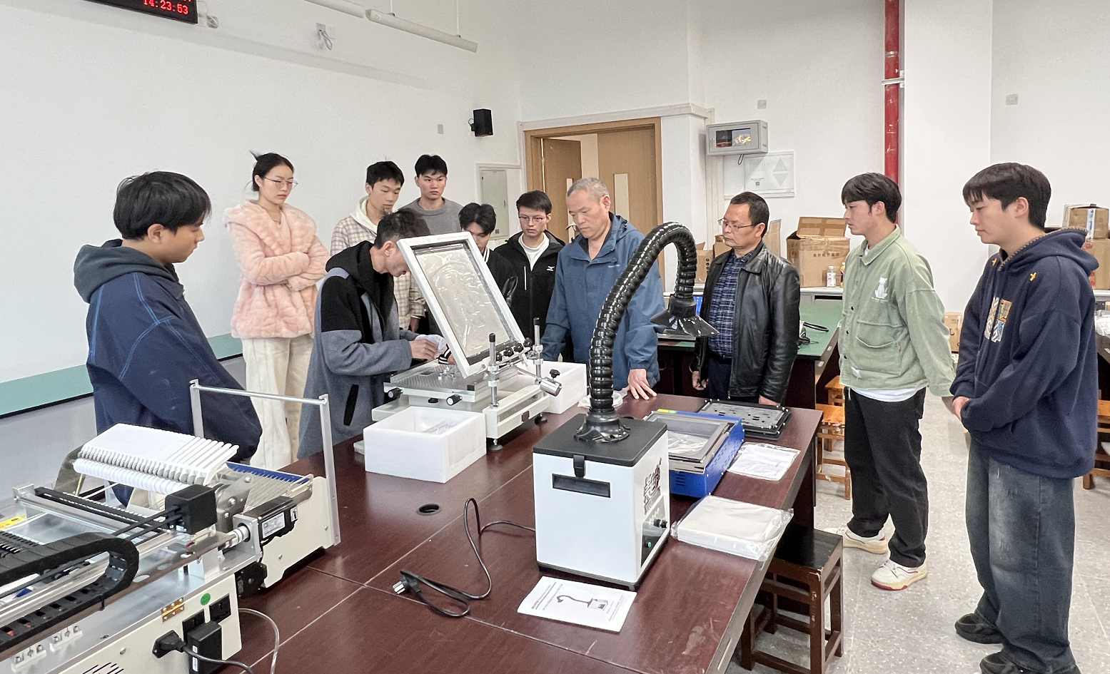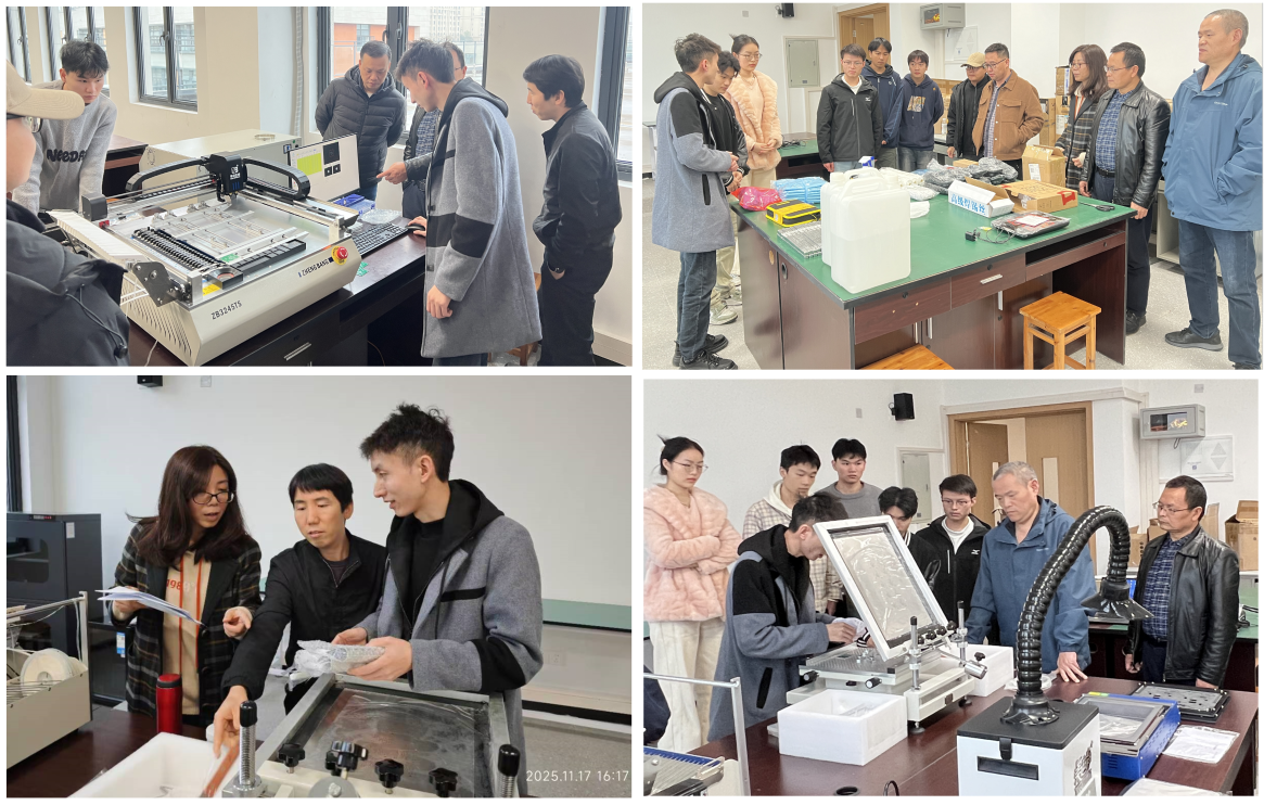 2025年11月17日下午2点,在茶园校区信智楼B410测控创新开发实验室开展了“SMT焊接实验线的操作与维护”专题培训。本次培训由华企正邦自动化科技有限公司的资深工程师主讲,测控与自动化系王荣秀、屈盈飞、肖湘、刘永贵,实验室赵欣、王子康等教师以及部分本科生和研究生共同参与。